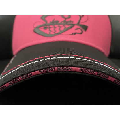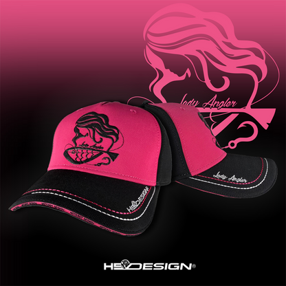 Козирка: текст Lady Angler и бродирано лого Hotspot Design, две големи шевни линии в бял и розов цвят, сандвич в контрастен цвят с лого Hotspot Design, отпечатано по цялата дължина.