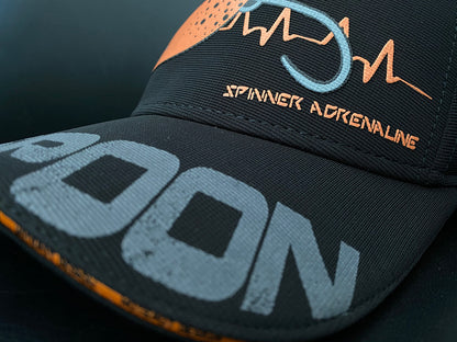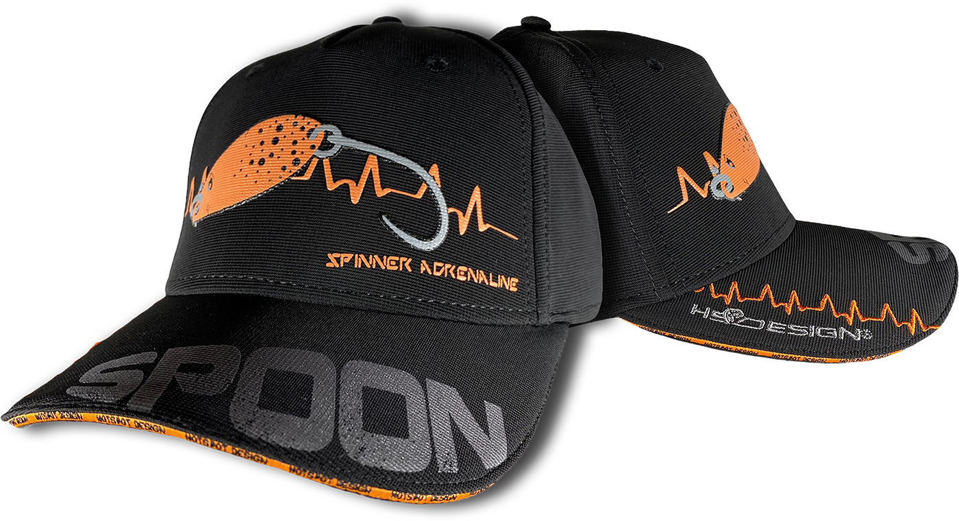 Предна част на капачката: Примамка за лъжица с добре очевиден релефен печат с линии „адреналин“, бродирани от двете страни.