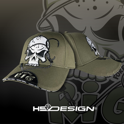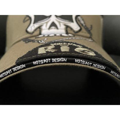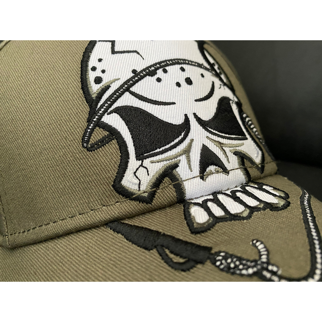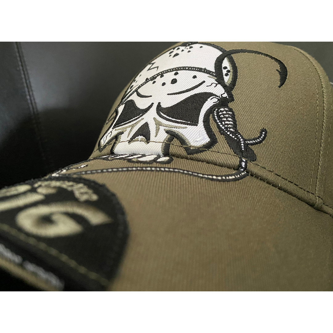 Предна част на шапката: произведение на изкуството Rig Forever, бродирано отпред и продължаващо върху козирката.